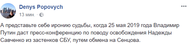 12:01  "А представьте себе иронию судьбы, когда 25 мая 2019 года Владимир Путин даст пресс-конференцию по поводу освобождения Надежды Савченко из застенков СБУ, путем обмена на Сенцова", - иронизирует журналист Денис Попович.