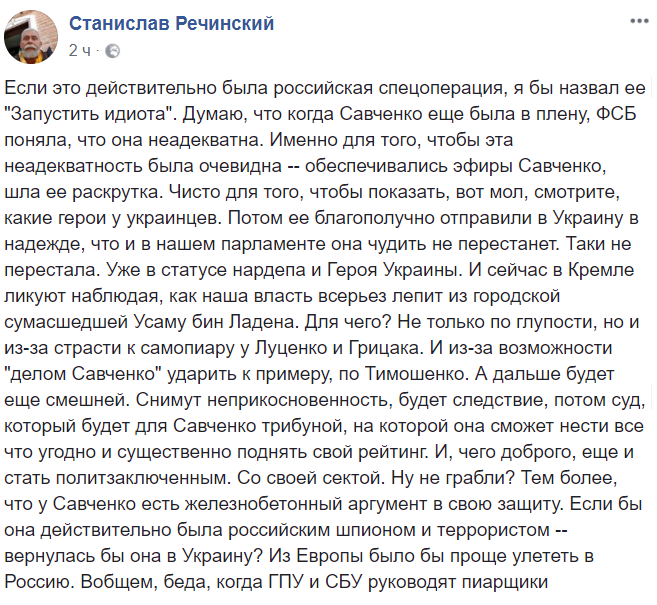 Тем более, что у Савченко есть железнобетонный аргумент в свою защиту. Если бы она действительно была российским шпионом и террористом - вернулась бы она в Украину? Из Европы было бы проще улететь в Россию. Вобщем, беда, когда ГПУ и СБУ руководят пиарщики", - пишет журналист Станислав Речинский.