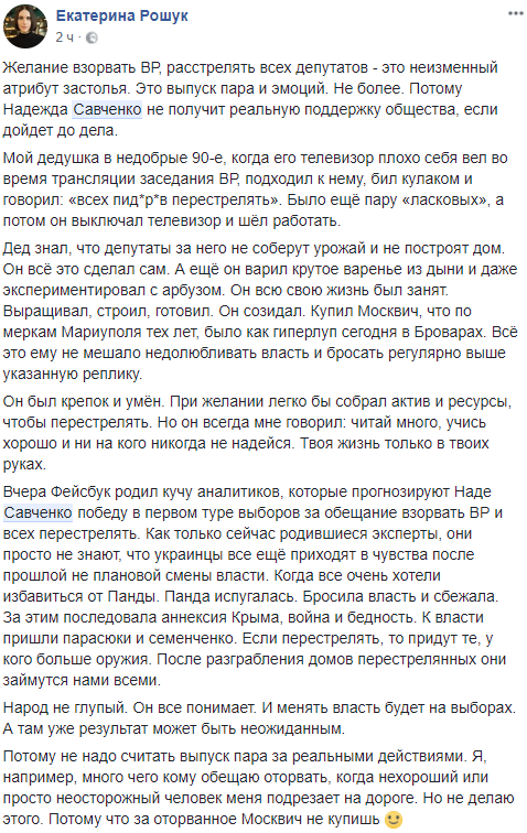 "Вчера Фейсбук родил кучу аналитиков, которые прогнозируют Наде Савченко победу в первом туре выборов за обещание взорвать ВР и всех перестрелять.
