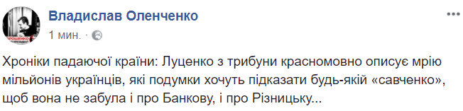 12:46  "Хроники падающей страны: Луценко с трибуны красноречиво описывает мечту миллионов украинцев, которые мысленно хотят подсказать любой "савченко", чтобы она не забыла и Банковую, и Резницкую", - пишет блогер Владислав Оленченко.