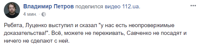 12:12  "Ребята, Луценко выступил и сказал "у нас есть неопровержимые доказательства!". Всё, можете не переживать, Савченко не посадят и ничего не сделают с ней", - шутит шоумен Владимир Петров, намекая на похожие обвинения против Саакашвили, которые окончились ничем.