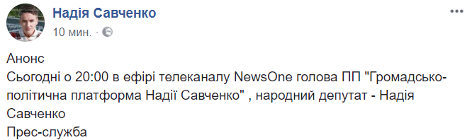 13:14  Сегодня в 20:00 Надежда Савченко выступит по телевидению.