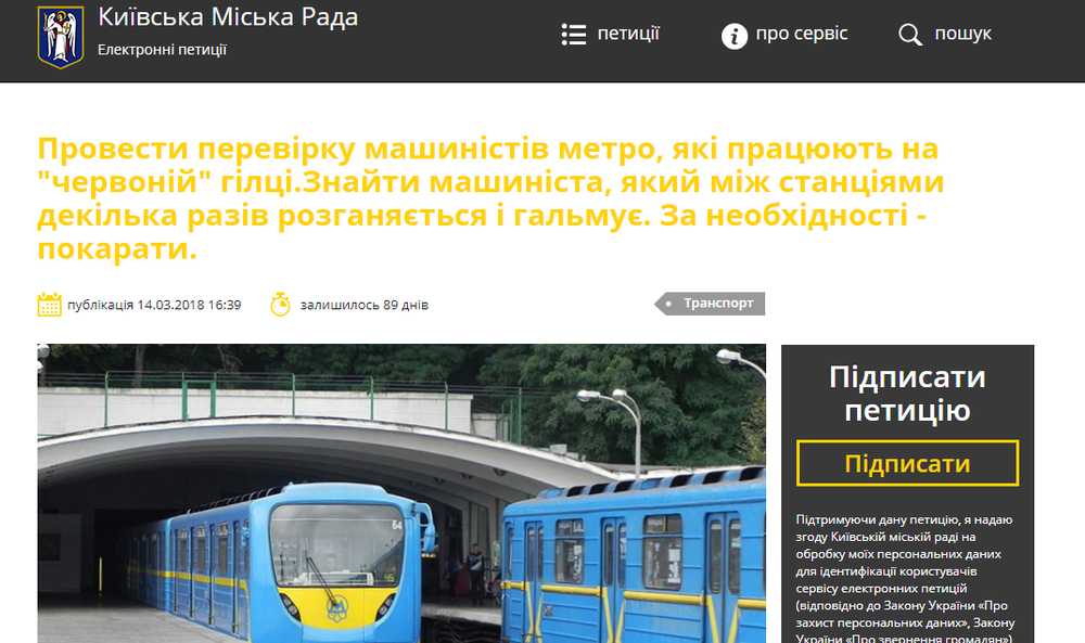 Петиция с требованием наказать одного из машинистов, работающих на красной ветке киевского метро появилась на сайте Киевсовета.