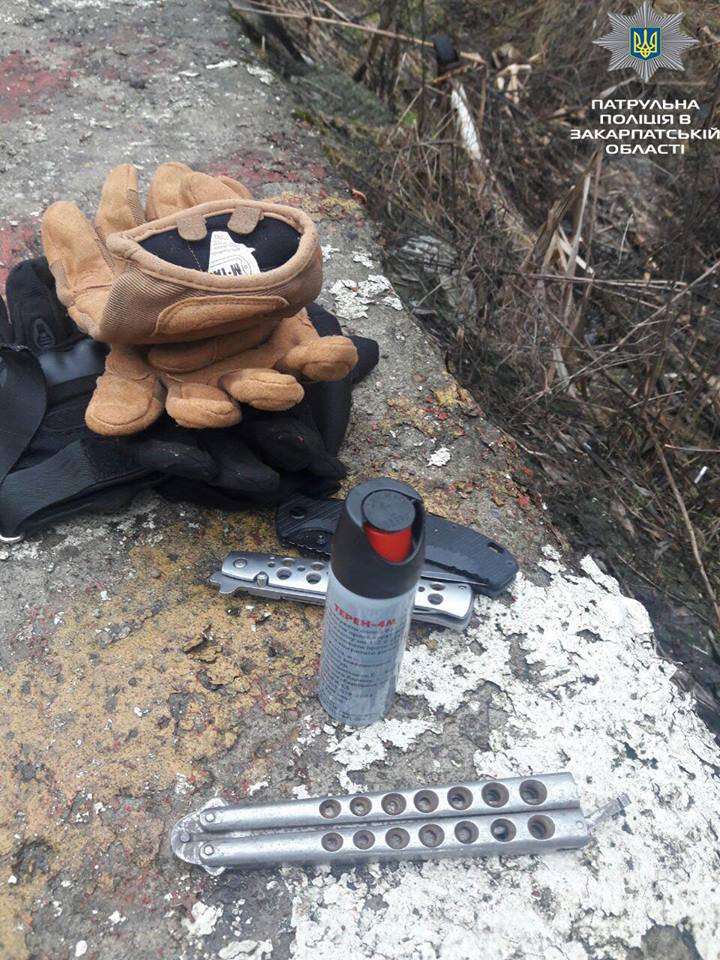Впоследствии, блюстители порядка, остановили Volkswagen. Согласно статьи 34 ЗУ "Про Национальную полицию", провели поверхностную проверку, во время которой у пассажиров транспортного средства патрульные обнаружили три ножа, балаклаву и газовый баллончик