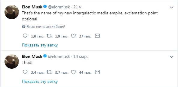 Бизнесмен опубликовал серию постов, посвященных новому проекту. Началось все с публикации междометия thud, сопровожденного восклицательным знаком. Оно означает звук столкновения вроде "бум" или "бац". Затем изобретатель пояснил, что это — название его новой межгалактической медиаимперии, а "восклицательный знак необязателен".