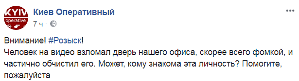 "Человек на видео взломал дверь нашего офиса, скорее всего фомкой, и частично обчистил его. Может, кому знакома эта личность? Помогите, пожалуйста", - указано в опубликованном сообщении.