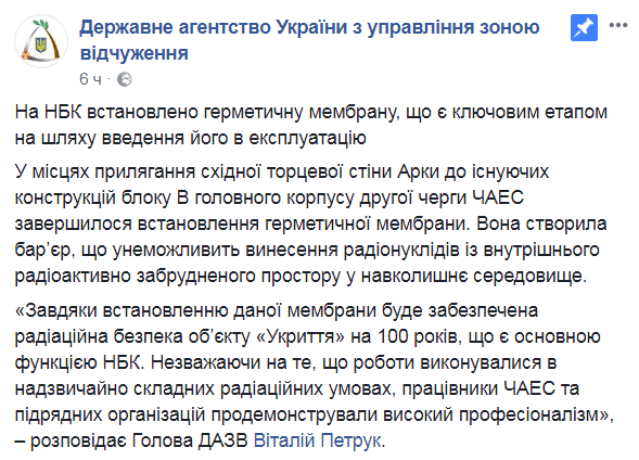 По словам председателя ГАЗО Виталия Петрука, благодаря установлению данной мембраны будет обеспечена радиационная безопасность объекта "Укрытие" на 100 лет, что является основной функцией НБК.