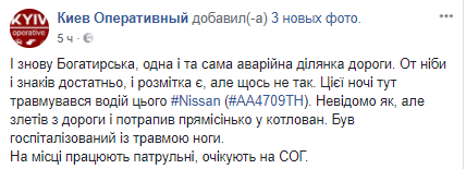 Инцидент произошел на улице Богатырской в Оболонском районе города. Водитель Nissan слетел с дороги и попал прямо в котлован. Он был госпитализирован с травмой ноги. На месте работали патрульные.