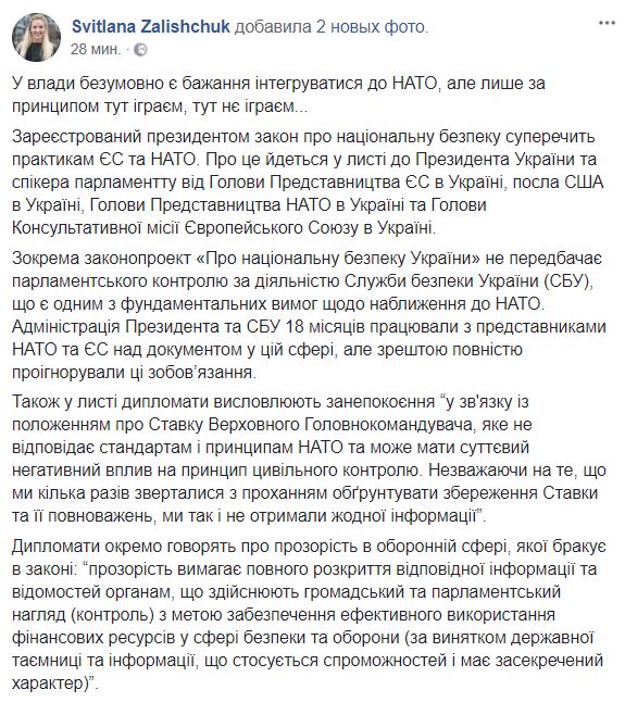 Посол США Мари Йованович, глава Представительства ЕС в Украине Хью Мингарелли, глава Консультативной миссии Европейского Союза в Украине Кястутис Ланчинскас и глава Представительства НАТО в Украине Александр Винников раскритиковали президентский закон о национальной безопасности. Об этом они сообщили в письме адресованном Петру Порошенко.