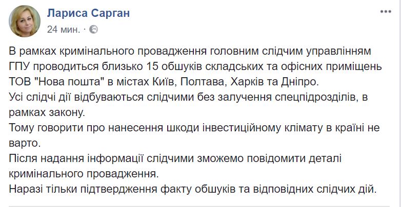 "В рамках уголовного производства главным следственным управлением ГПУ проводится около 15 обысков складских и офисных помещений ООО "Новая Почта" в городах Киев, Полтава, Харьков и Днепр. Все следственные действия происходят следователями без привлечения спецподразделений, в рамках закона"- написала Сарган на своей странице в Facebook.