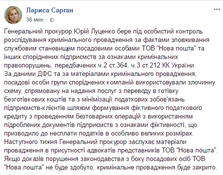 "По данным ГФС и по материалам уголовного производства, должностные лица группы родственных компаний использовали преступную схему, направленную на оказание услуг по переводу в наличность безналичных средств и по минимизации налоговых обязательств предприятий-клиентов путем формирования фиктивного налогового кредита с проведением бестоварных операций с использованием поддельных документов предприятий с признаками фиктивности, что приводило к неуплате налогов в особо крупных размерах. На следующей неделе Генеральный прокурор заслушает материалы производства в присутствии адвокатов представителей ООО "Новая почта". Если доказательств нарушения законодательства со стороны должностных лиц ООО "Новая почта" не будет получено, уголовное производство будет закрыто", - говориться в сообщении Ларисы Сарган.