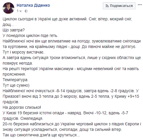 "Циклон сегодня в Украине еще очень активен. Снег, ветер, мокрый снег, дождь ... Что завтра? В понедельник циклон уйдет.Ближайшей ночью он еще будет влиять на погоду, предопределять снегопады и метели, на крайнем юге - дожди. К северу почти не дотягивает. Здесь и мороза хватает. А завтра днем ситуация немного угомонится, лишь в восточных областях еще побушует непогода.