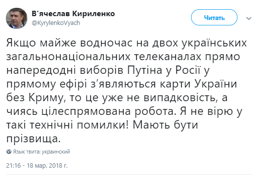 "Если почти одновременно на двух украинских общенациональных телеканалах прямо накануне выборов Путина в России в прямом эфире появляются карты Украины без Крыма, это уже не случайность, а чья-то целенаправленная работа", - заявил вице-премьер.