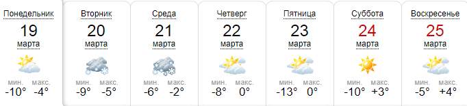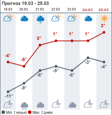 Сайт Weather.com сообщает, что до среды днем будет держаться минусовая температура -1...-3. С четверга днем ожидается плюсовая температура +1...+4. Снег возможен 20 и 21 марта.