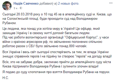 "Сегодня 20.03.2018 года в 10:45 в апелляционном суде Киева, на Соломнской площади, будет проходить суд над Владимиром Рубаном. Это человек, который больше всего хотел мира в Украине! Это офицер, который защищал Украину и в своей жизни помог многим людям.