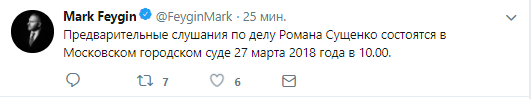 Предварительные слушания по делу украинского политзаключенного в России Романа Сущенко состоятся 27 марта. Об этом сообщил адвокат Марк Фейгин на странице в Twitter.
