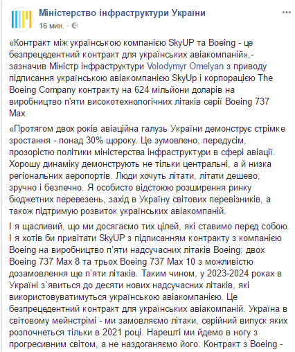 "Контракт между украинской компанией SkyUP и Boeing - это беспрецедентный контракт для украинских авиакомпаний", - отметил министр инфраструктуры Владимир Омелян.