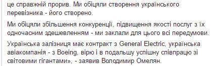"Это беспрецедентный контракт для украинских авиакомпаний. Украина в мировом мейнстриме - мы заказываем самолеты, серийный выпуск которых начнется только в 2021 году. Наконец мы идем в ногу с прогрессивным миром, а не догоняем его. Контракт с Boeing - это настоящий прорыв. Мы обещали создания украинского перевозчика - он создан. Мы обещали увеличение конкуренции, повышение качества услуг по их одновременным удешевлением - мы заложили для этого все предпосылки. Украинская железная дорога контракт с General Electric? украинская авиакомпания - с Boeing, верю и в дальнейшее успешное сотрудничество с мировыми гигантами", - заявил Владимир Омелян.