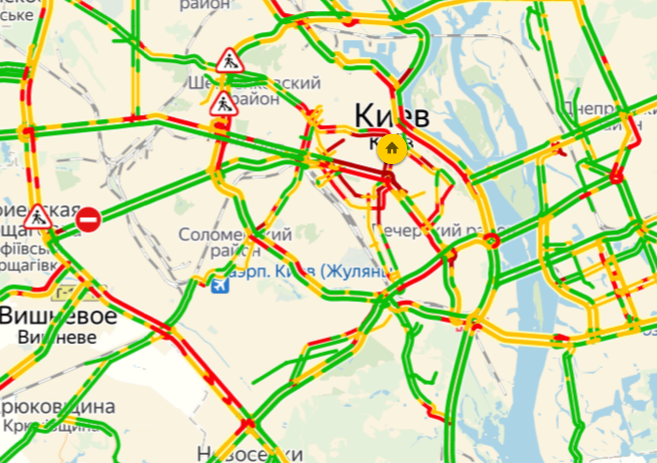 Вечером 20 марта пробки в Киеве достигли 9 баллов. Движение затруднено в центре столицы, на правом берегу.