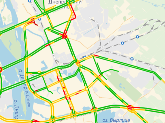 На противоположном берегу Днепра пробки образовались лишь в районе развязки у ст. м. "Левобережная", по ул. Гната Хоткевича и вокруг Дарницкой площади.