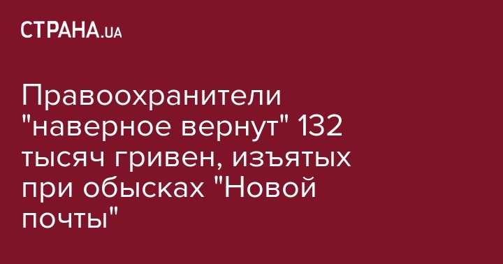 Правоохранители намерены вернуть предназначенные для денежных переводов 132 тыс. гривен, которые были изъяты в ходе обысков офисов компании экспресс-доставки "Новая почта". Об этом "Украинским Новостям" сообщил сотрудник правоохранительных органов.