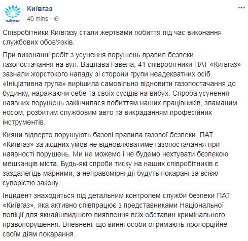 При выполнении работ по устранению нарушений правил безопасности газоснабжения на ул. Вацлава Гавела, 41 сотрудники ПАО "Киевгаз" подверглись нападению со стороны группы неадекватных лиц. Об этом сообщили на официальной странице "Киевгаза" в Facebook.