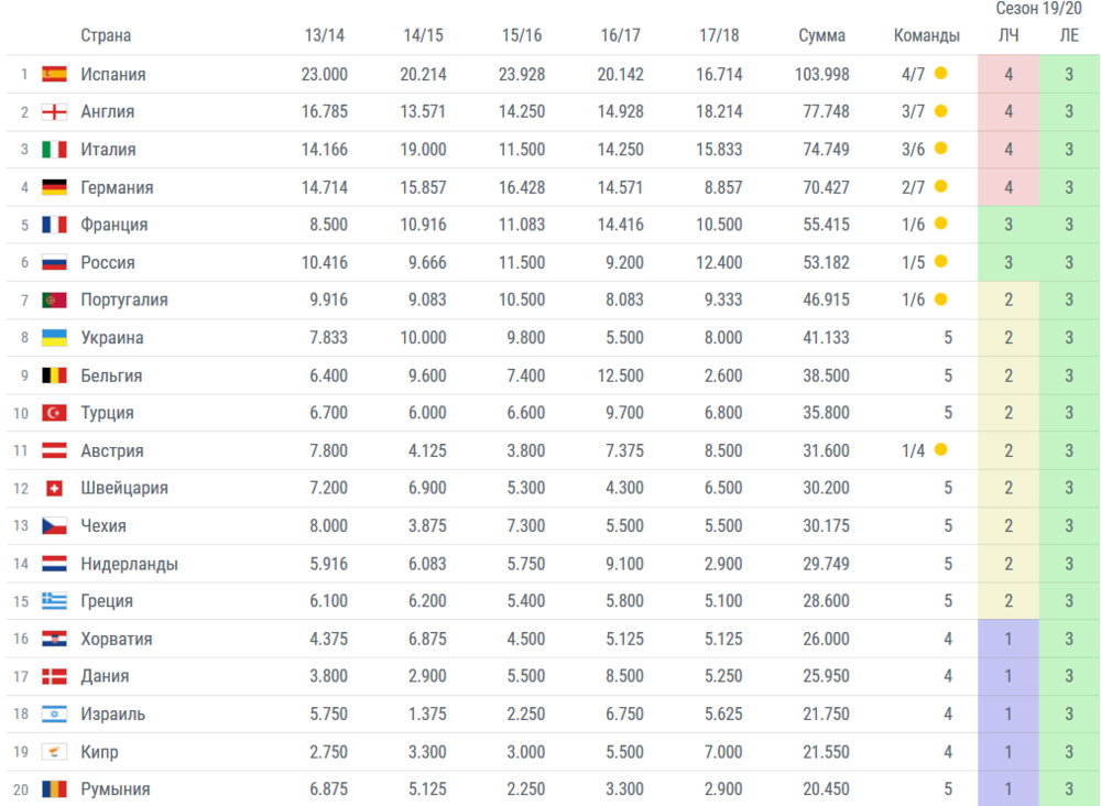 Напомним, что национальный коэффициент представляет собой сумму среднего значения за текущий сезон (общее количество набранных баллов делится на число клубов ассоциации, участвующих в еврокубковом сезоне) и результатов предыдущих четырех сезонов. Если две ассоциации будут иметь одинаковый коэффициент, более высокое место займет страна с более высоким коэффициентом за последний сезон.