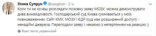 "Если ты не хочешь рассматривать исковое заявление Минздрава Украины, можно демонстрировать чудеса изобретательности. Хозяйственный суд Киева сомневается в моих полномочиях. Сайт КМУ, МЗУ и ЕГР (у суда есть расширенный доступ) - ненадежные источники. Переподали заявление и ждем с нетерпением реакцию", - написала Супрун 21 марта.