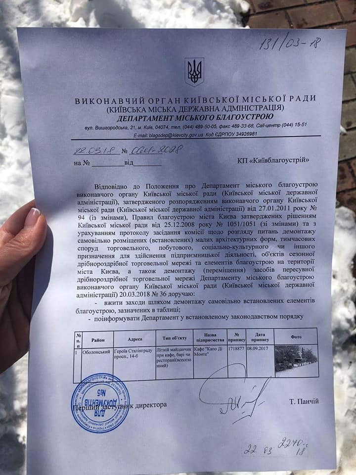Сегодня сотрудники КП "Киевблагоустройство" в Оболонском районе начали демонтировать ресторан итальянской кухни Capo di Monte.