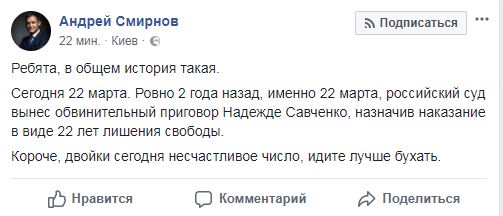 "Сегодня 22 марта. Ровно 2 года назад, именно 22 марта, российский суд вынес обвинительный приговор Надежде Савченко, назначив наказание в виде 22 лет лишения свободы. Короче, двойки сегодня несчастливое число, идите лучше бухать", - написал он.