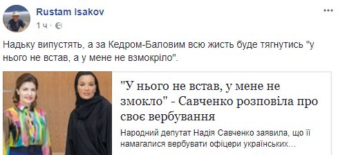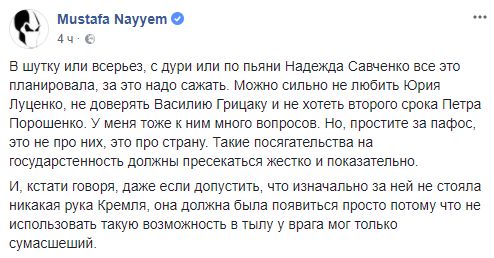 Народный депутат Мастафа Найем также выступил за то, что Савченко необходимо посадить в тюрьму: "В шутку или всерьез, с дури или по пьяни Надежда Савченко все это планировала, за это надо сажать. Можно сильно не любить Юрия Луценко, не доверять Василию Грицаку и не хотеть второго срока Петра Порошенко. У меня тоже к ним много вопросов. Но, простите за пафос, это не про них, это про страну. Такие посягательства на государстенность должны пресекаться жестко и показательно.