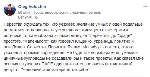 Политолог Олег Волошин: "Перестал осуждать тех, кто уезжает. Желание умных людей подальше держаться от нервного, неустроенного, живущего от истерики к истерике, от самообмана к самообману, от "перемоги" до "зради" простого, "маленького", как говорил Ющенко, украинца, понятно и неизбежно. Савченко, Парасюк, Ляшко, Мосийчук - вот его, такого украинца, прямые порождения. Не будь такого избирателя, умные и циничные кукловоды не создавали бы и такие проекты. Как сказал мне осенью в кулуарах ПАСЕ один показательно очень патриотичный депутат: "Человеческий материал так себе".