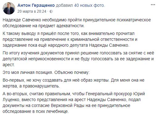 По итогу изучения документов принял решение голосовать за снятие с нее депутатской неприкосновенности и не буду голосовать за ее задержание и арест. Это моя личная позиция. Объясню почему: Во-первых, не хочу создавать для неё образ жертвы. Для меня она не жертва, а правонарушитель. А во-вторых, считаю правильным, чтобы Генеральный прокурор Юрий Луценко, вместо представления на арест Надежды Савченко, подал документы на согласие Верховной Рады на ее принудительное обследование в псих лечебнице".
