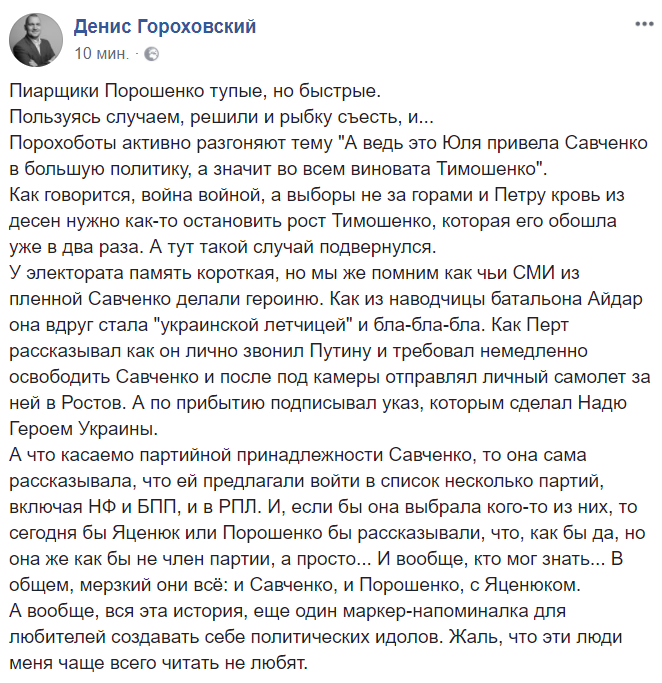 А что касаемо партийной принадлежности Савченко, то она сама рассказывала, что ей предлагали войти в список несколько партий, включая НФ и БПП, и в РПЛ. И, если бы она выбрала кого-то из них, то сегодня бы Яценюк или Порошенко бы рассказывали, что, как бы да, но она же как бы не член партии, а просто... И вообще, кто мог знать... В общем, мерзкие они все: и Савченко, и Порошенко, с Яценюком".