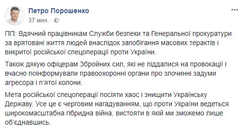 Цель российской спецоперации посеять хаос и уничтожить украинское государство. Все это является очередным напоминанием, что против Украины ведется широкомасштабная гибридная война, выстоять в которой мы сможем только объединившись".