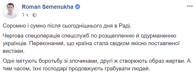 Депутат Роман Семенуха: "Стыдно и грустно после сегодняшнего дня в Раде. Очередная спецоперация спецслужб разделению и одурманиванию украинцев. Убежден, что страна стала свидетелем качественно поставленного представления.