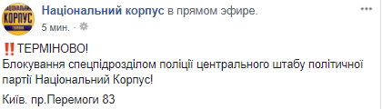 "Полиция ворвалась внутрь и все там заблокировала. Никого не пропускают. Недавно пустили только Билецкого", – заявили в Нацкорпусе.