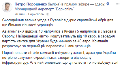 "Сегодняшняя крупная сделка с Ryanair откроет европейские горизонты для еще большего количества украинцев. Авиакомпания откроет 10 направлений из Киева и 5 направлений из Львова в Европу. Самые дешевые билеты будут стоить от 10 евро, а средняя стоимость билета для Украины будет ниже 40 евро. Компания рассчитывает за первый год перевезти 1 млн украинцев.