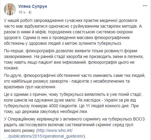 "В нашей работе внедрение современных практик медицинской помощи часто должно происходить одновременно с разрушением устаревших методов. А вместе с ними и мифов, порожденных советской системой здравоохранения. Одним из них является проведение массовых флюорографических обследований у здоровых людей с целью остановить туберкулез", – написала она.