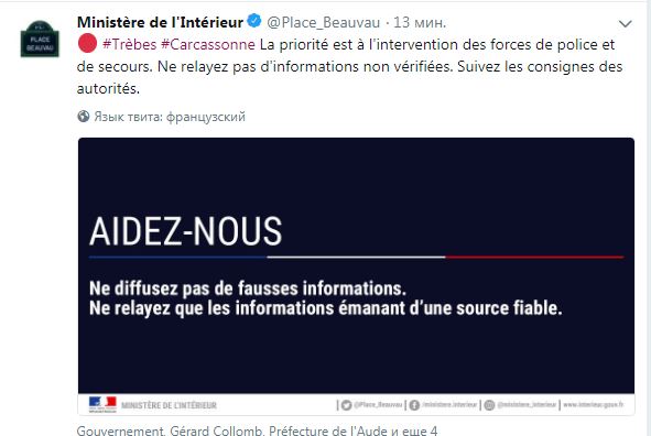 Инцидент уже прокомментировало МВД Франции. В официальном Twitter ведомства появилось сообщение, согласно которому полиция продолжает работать на месте происшествия. Приоритетом операции является спасение заложников.