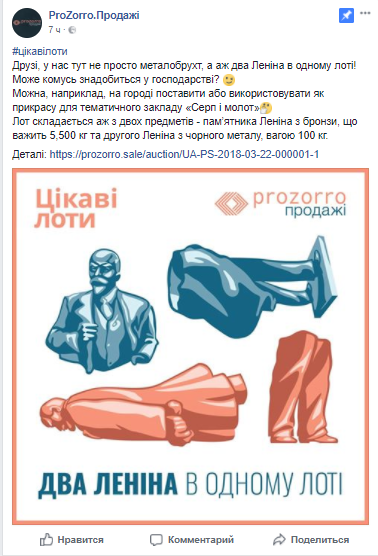 Сервис публичных и государственных закупок ProZorro выставил на аукцион два памятника Ленину, выполненных из металла и снесенных в рамках декоммунизации. Об этом сообщается на Facebook-странице сервиса.