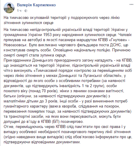 На контрольном пункте пропуска через линию разграничения, расположенном на временно оккупированной территории Украины, скончался мужчина. Об этом в пятницу, 23 марта, сообщает пресс-офицер Донецкого пограничного отряда Валерия Карпиленко на своей странице в Facebook.