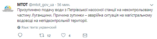 Петровская насосная станция прекратила подачу воды на временно неподконтрольную Киеву часть Луганской области, по причине аварии на магистральном водоводе.