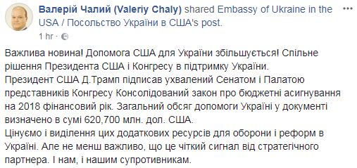 "Важная новость! Помощь США для Украины увеличивается! Совместное решение президента США и Конгресса в поддержку Украины. Президент США Трамп подписал принятый Сенатом и Палатой представителей Конгресса Консолидированный закон о бюджетных ассигнованиях на 2018 финансовый год. Общий объем помощи Украине в документе определен в сумме $620,7 млн", – написал он.
