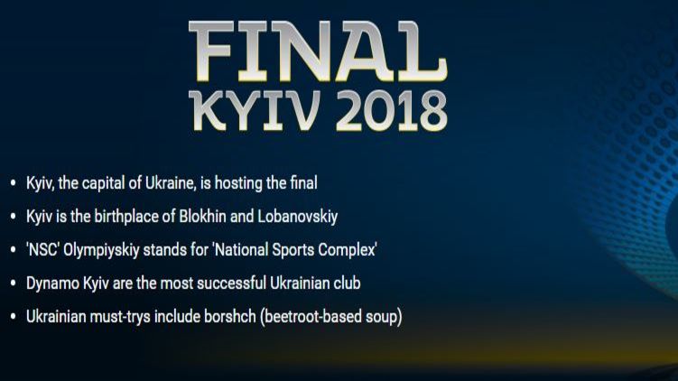 "Киев известный своими улицами, обрамленными деревьями, зеленым пространством и церквями. Место рождения великих Олега Блохина и Валерия Лобановского. Город-побратим Баку, Чикаго, Эдинбурга, Киото и Мюнхена. Безопасный, дешевый и почти столь же густонаселенный, как Мадрид", - такими словами описали столицу Украины в УЕФА.