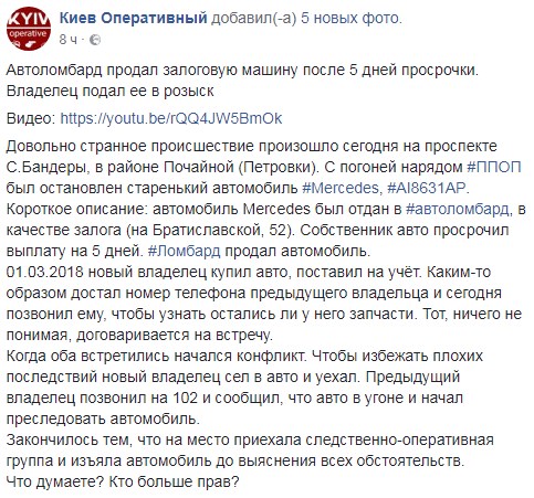 "Короткое описание: автомобиль Mercedes был отдан в автоломбард, в качестве залога (на Братиславской, 52). Собственник авто просрочил выплату на 5 дней. Ломбард продал автомобиль. Новый владелец купил авто, поставил на учёт. Каким-то образом достал номер телефона предыдущего владельца и сегодня позвонил ему, чтобы узнать остались ли у него запчасти. Тот, ничего не понимая, договаривается на встречу", - говорится в сообщении.
