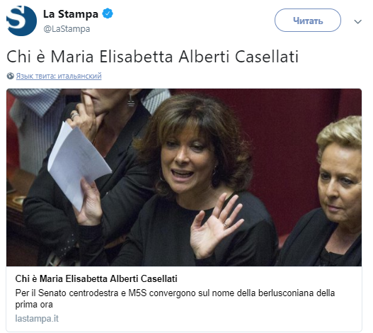 В субботу, 24 марта, Сенат Италии впервые в истории страны возглавила женщина. Представители правоцентристской коалиции и "Движения пяти звезд" проголосовали за избрание представительницы правой партии "Вперед, Италия" Марии Элизабетты Казеллати.