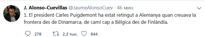 "Председатель Карлес Пучдемон был задержан в Германии, когда он пересекал границу с Данией, направляясь в Бельгию из Финляндии", - написал адвокат Жауме Алонсо-Куэвильяс в своем микроблоге в Twitter.