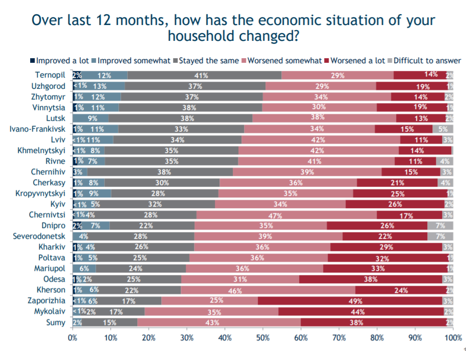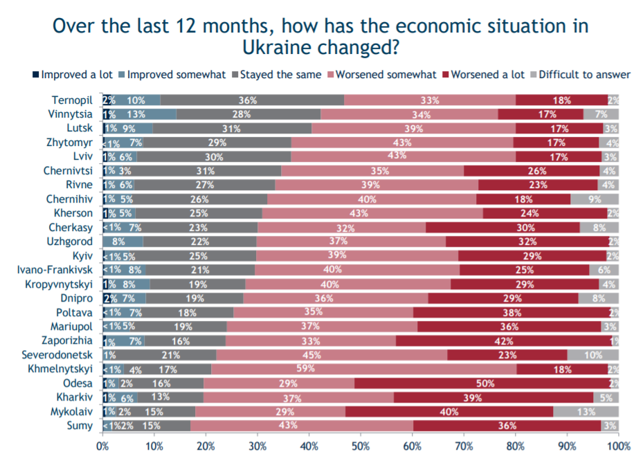 Впрочем, и здесь картина зеркальная – доля ответов "состояние ухудшилось" оказалась самой большой. Хуже всего дела обстоят в Запорожье (74% заявили об ухудшении), Николаеве (79%) и Сумах (81%).