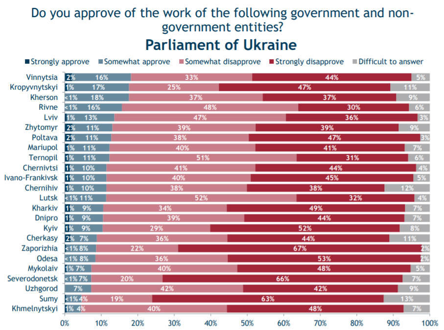 Недоверие к парламенту еще выше – оно доходит в отдельных городах до 88% (например, в Хмельницком). Кстати, лидер по одобрению Верховной Рады – снова Винница! Собирательный образ украинского депутата пришелся там по душе 16% опрошенных.